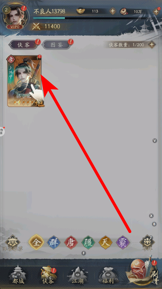 1、选角编队进入侠客界面,点击已解锁侠客查看职业属性,依据关卡敌方阵营搭配克制流派,确认作战上阵后为挑战储备适配战力,避免属性被压制。