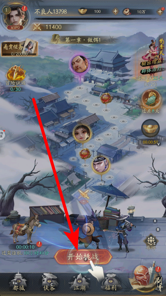2、触发挑战切换江湖界面,定位章节关卡的开始挑战按钮,点击进入对阵准备,同步检查阵容完整性,若战力不足可暂升星或调整锦囊,保障胜算。