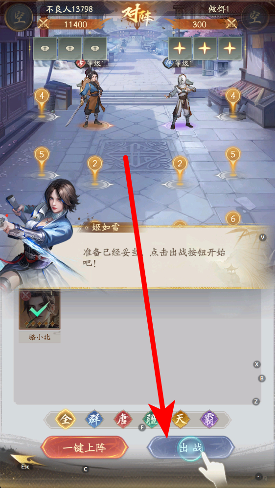 3、确认出战在对阵界面预览敌我站位与战力差,点击出战启动自动战斗,对战过程中观察侠客技能释放,后续可通过调整玉佩、锦囊优化输出节奏。