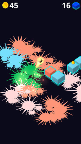1、进入游戏,点击屏幕操控球球跳动,击碎可获金币,注意彩色方块,规划顺序,优先清理难处理的。