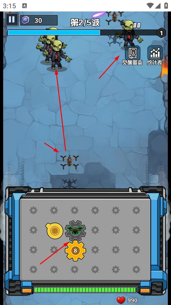 1、第1波时,从商店获取无人机齿轮,装配到界面自转齿轮右侧,召唤无人机助力战斗。