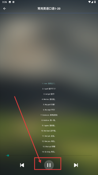 3、在内容播放页,点击底部暂停/播放按钮,控制“常用英语口语1-20内容的播放。