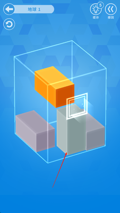 1、进入地球1关卡,观察透明立方体内方块布局,按红箭头方向明确橙色方块移动初始方向。