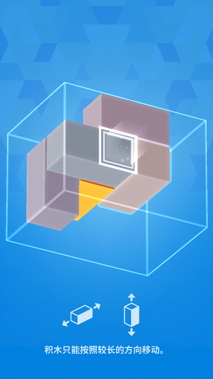 3、五阶难度梯度设计:难度从入门级到大师级逐步提升,入门级关卡空间简单、方块数量少,方向限制清晰,大师级关卡空间复杂、方块数量多,还会加入不可移动方块。