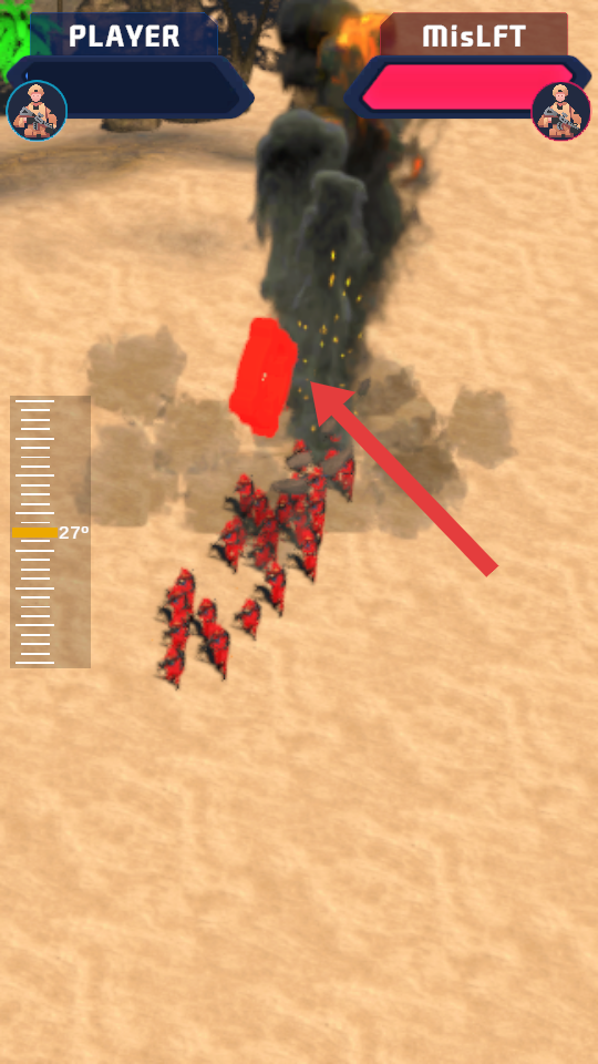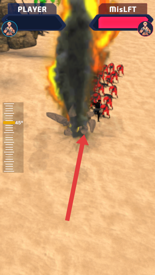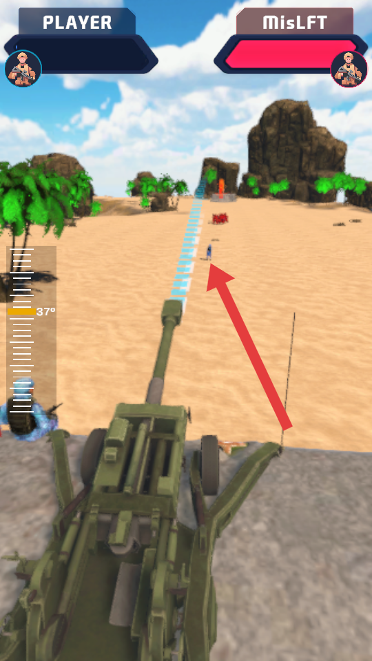 1、进入对战,屏幕左侧角度刻度辅助瞄准,长按开枪键蓄力,对准红色小兵密集处射击,快速清理敌人。