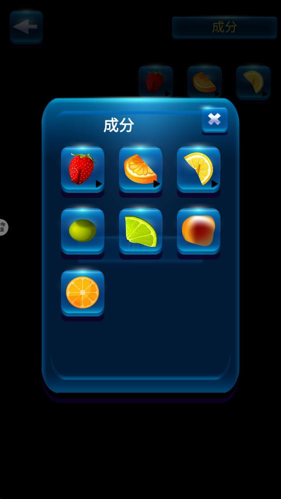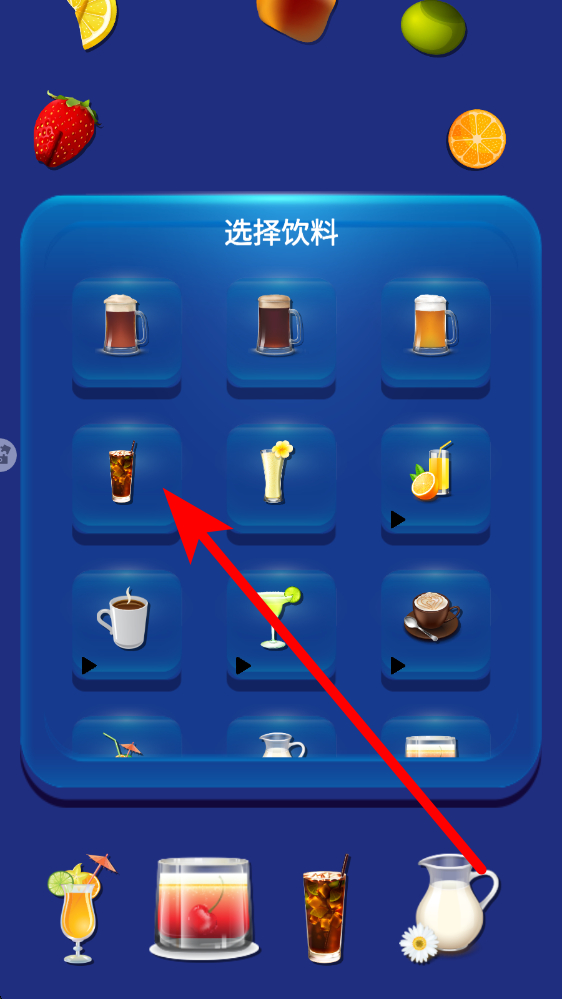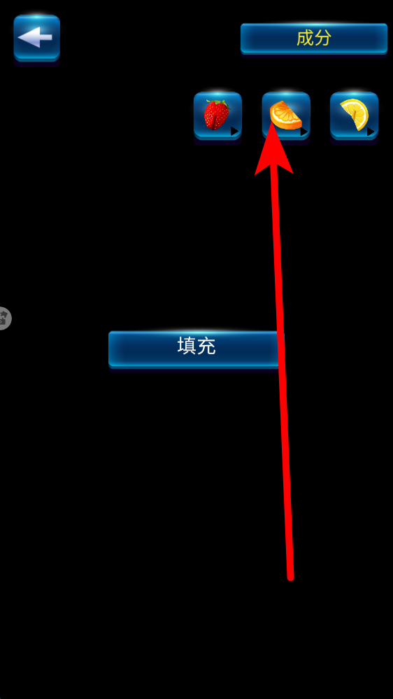 2、搭配饮品成分在成分界面,选取草莓橙子等食材图标,点击填充按钮,组合专属饮料配方,丰富饮品视觉与模拟饮用的细节呈现。