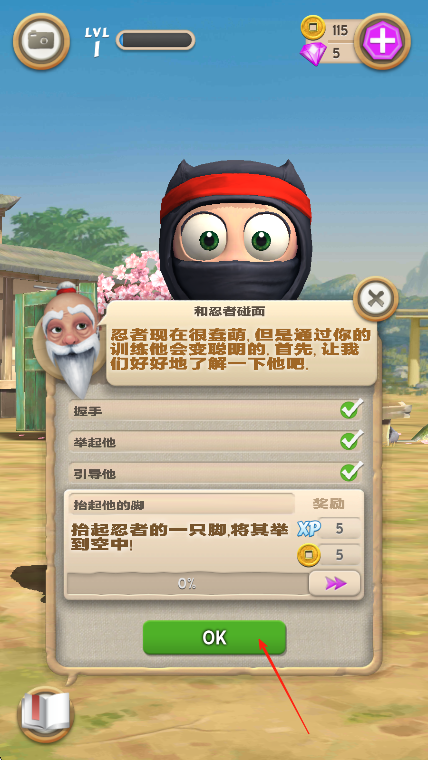 2、按提示,用手指操作忍者,像拖动、点击等,完成抬起脚等动作,获取奖励。