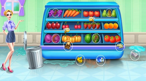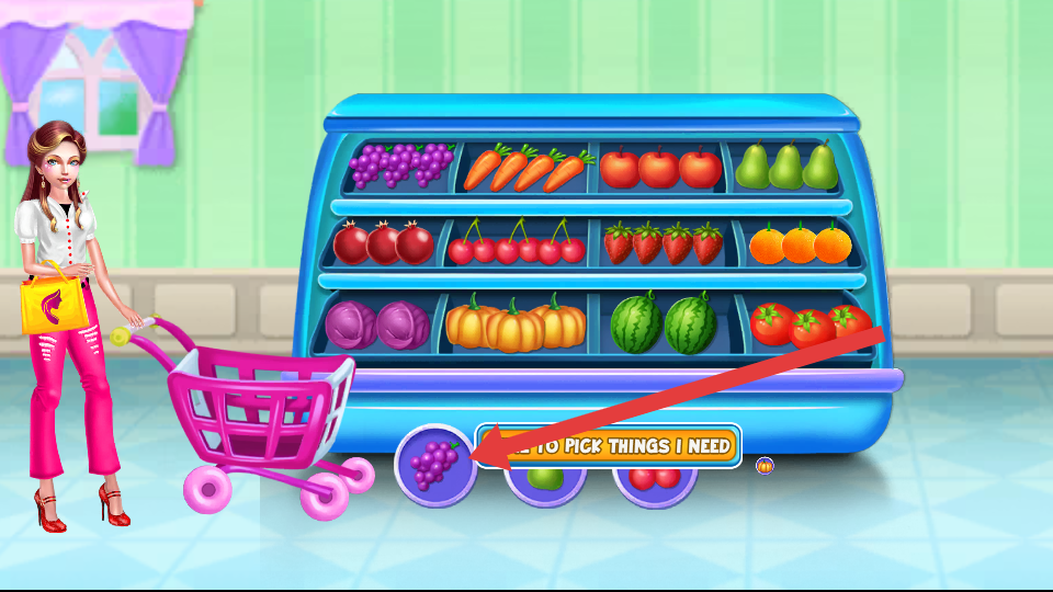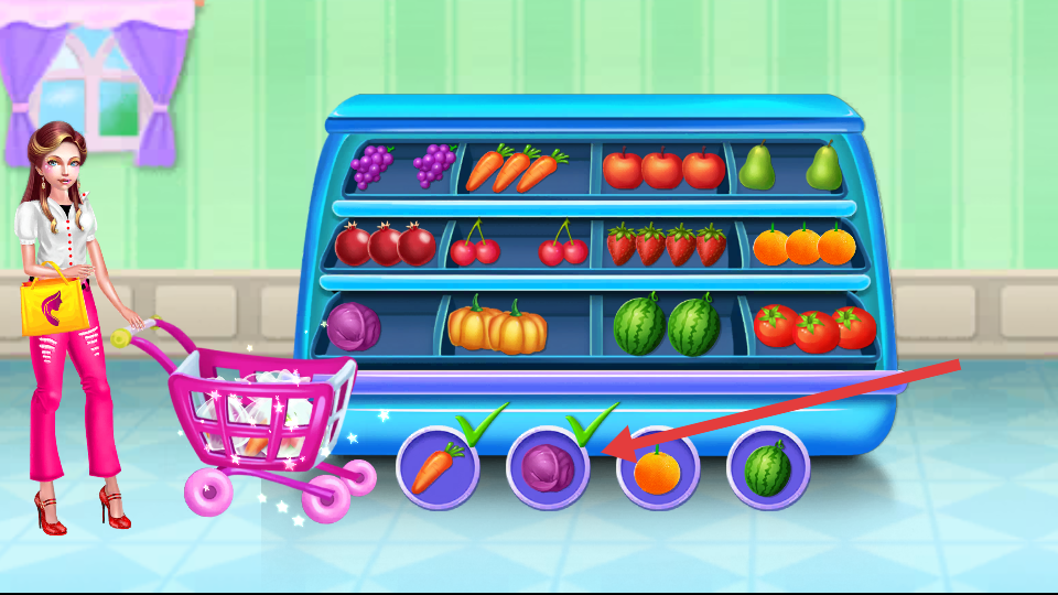 1、果蔬货架环节,看下方提示图标葡萄、胡萝卜等,点击对应的果蔬放入购物车,摆满即完成。
