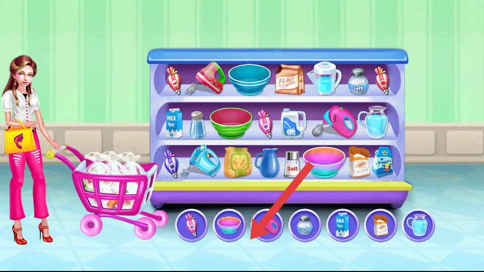 2、切换厨具的货架,依据下方提示打钩,表示已找好,逐个找货架上的物品,点击装上购物车。