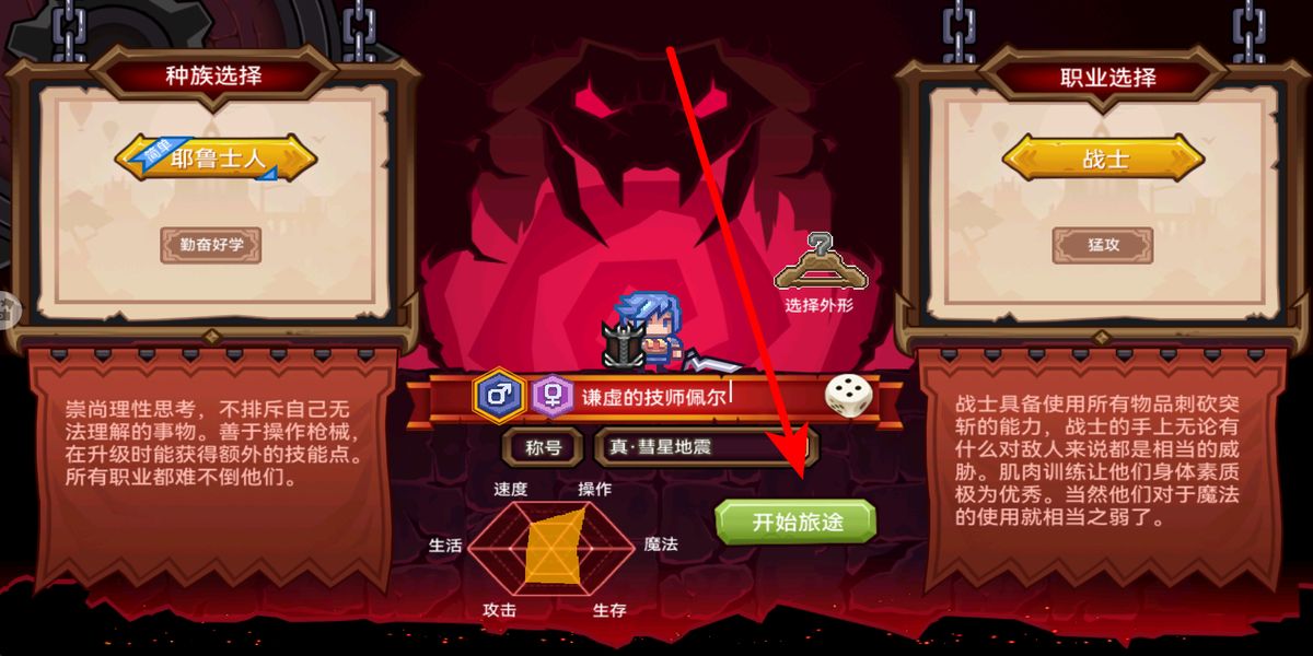 1、种族职业设定创建角色时,左侧选择种族耶鲁士人,右侧选定职业战士,擅长物理攻击,确定外形与称号后,点击开始旅途,奠定角色发展方向。