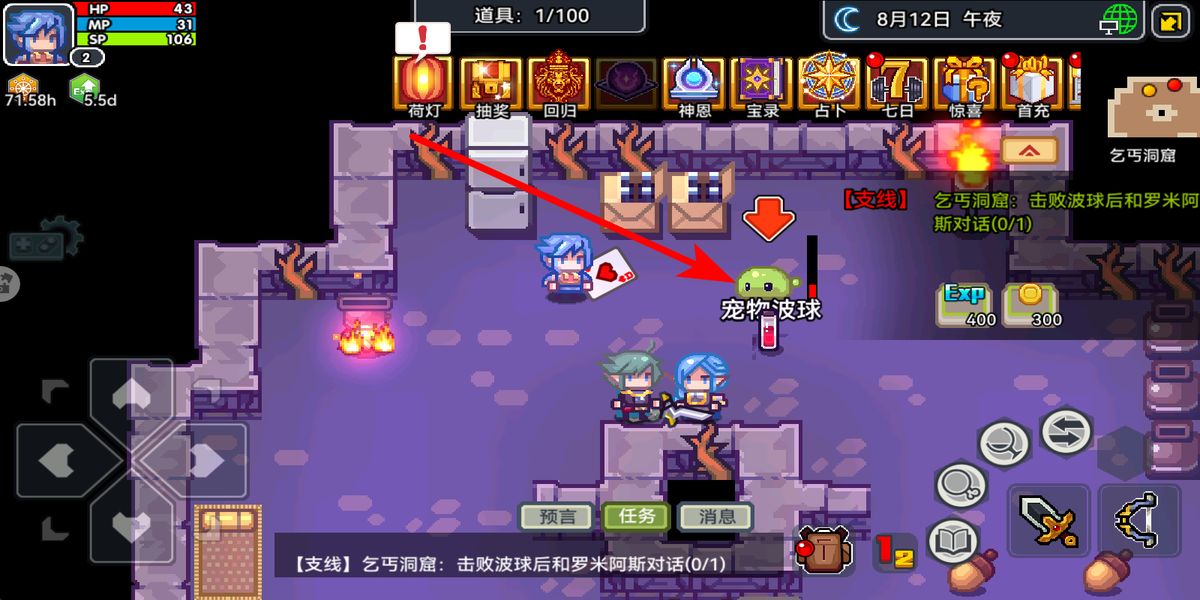 2、初期任务推进进入乞丐洞窟,跟随支线任务击败宠物波球,留意角色血量与战斗节奏,利用普攻或初始技能输出,胜利后与罗米阿斯对话,解锁冒险指引。
