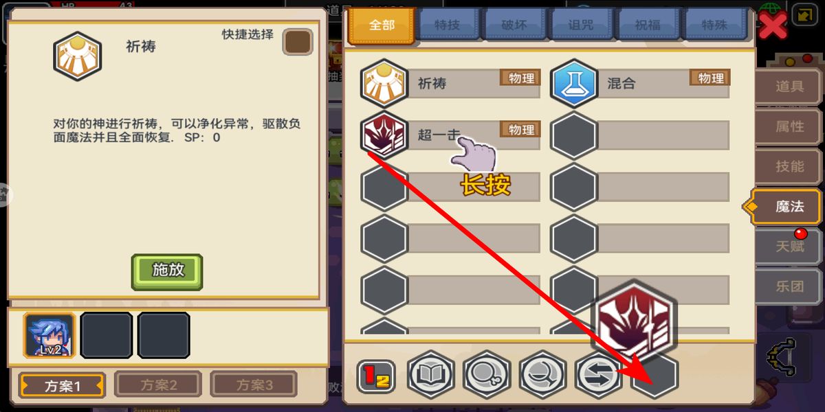 3、技能配置技巧打开魔法界面,长按技能超一击拖动至快捷栏,战斗时点击施放,祈祷可净化异常状态,按需配置技能方案,提升战斗应对灵活性。