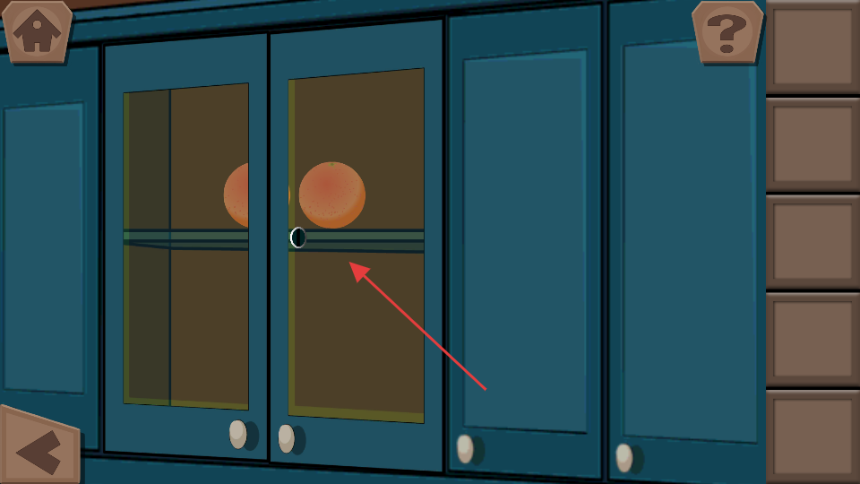 1、先搜索厨房,检查香蕉、刀具、盆栽,点开橱柜来找线索,玻璃柜的橙子可能关联到后续的解谜。