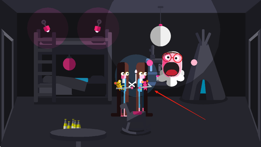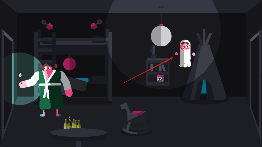 1、进入小屋,观察初始场景里的角色与物品,留意幽灵等元素,熟悉环境布局。