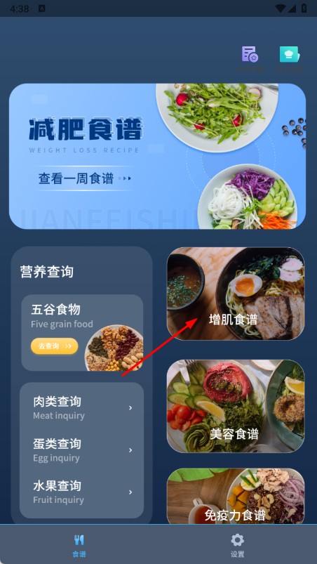 1、打开热量减肥食谱日记,在首页,点击增肌食谱。