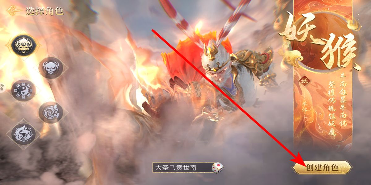 2、创建角色,进入选角的界面,选定妖猴其中之一等职业并设置名称后,点击创建角色按钮,完成角色设定,开启专属冒险之旅。