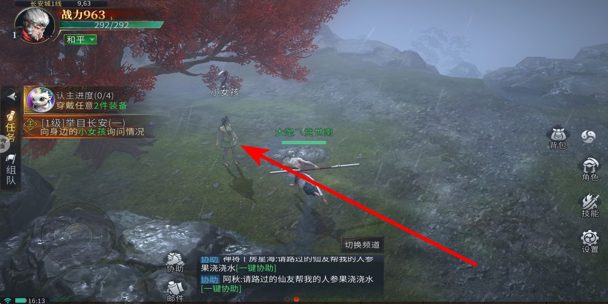 3、接取任务后,开始游戏场景后,找到附近身边的小女孩,接取举目长安一任务,按指引询问情况,开启前期的成长剧情任务线。
