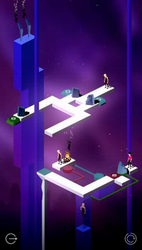 2、对紫色、绿色机械装置,滑动长按让角色靠近,通过互动如按压、拖拽触发机关,开启了新通路。