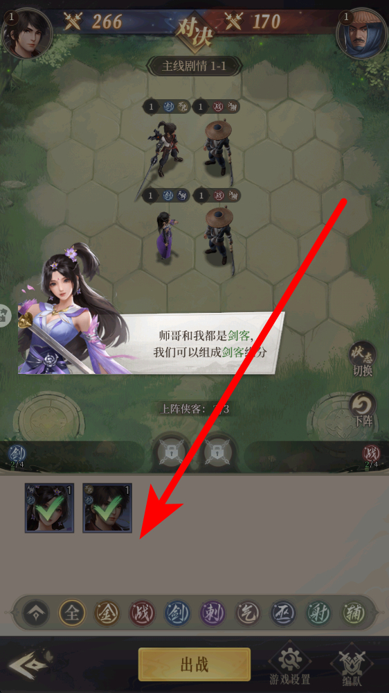 1、选阵营上阵,在对决界面,依据提示剑客羁绊,点击下方侠客图标勾选,凑齐对应阵营剑系,确认上阵人数后点击出战,构建基础战斗阵容。