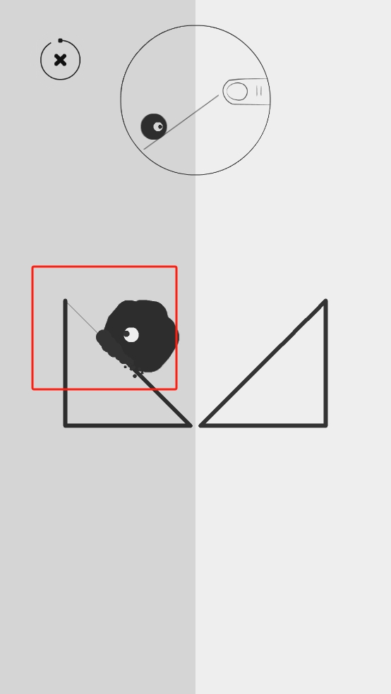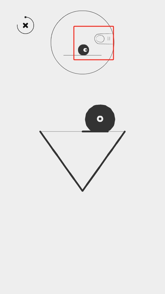 2、触发上方机关改变轨道,引导黑色物体沿新路径滚动,使其落入左侧红框区域,利用地形和轨道变化,精准控制物体落点。