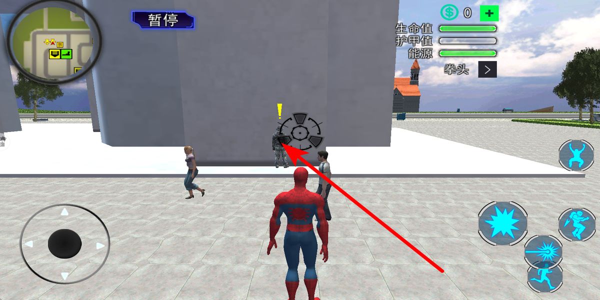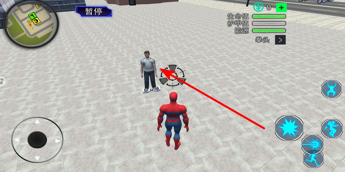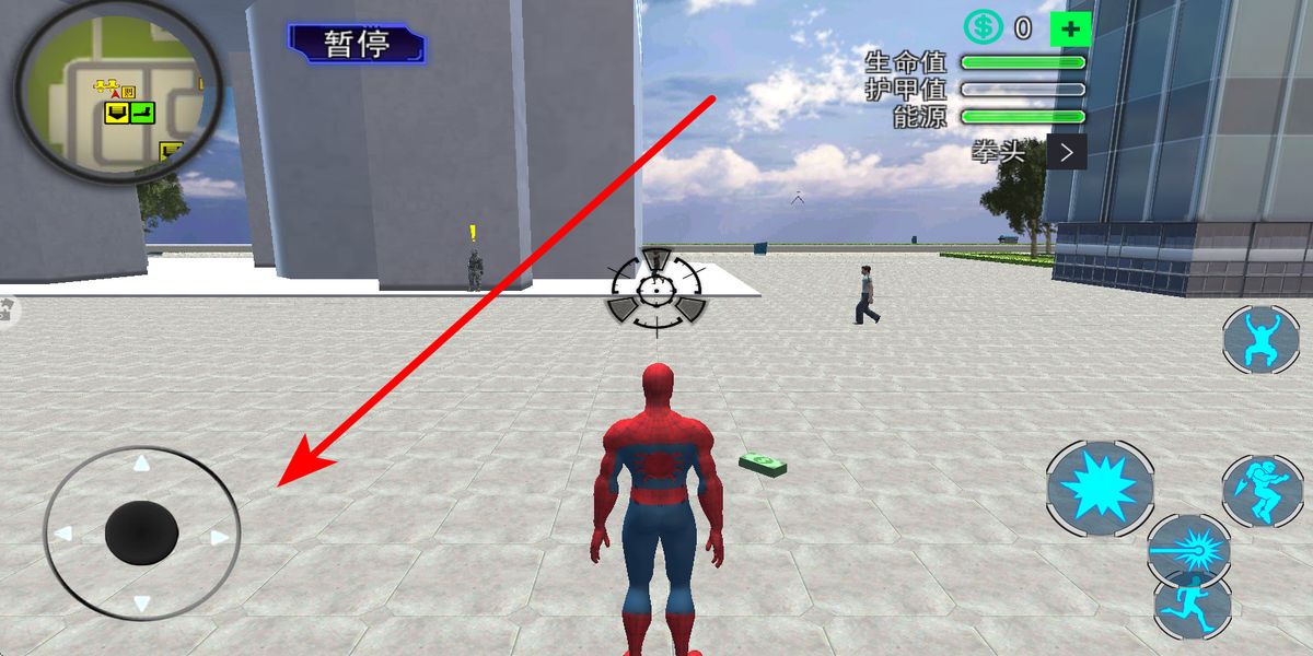 1、摇杆移动左下角摇杆控制角色方向,前后左右滑动,让蜘蛛人在场景移动,靠近任务目标区域,为交互做准备,灵活操作避开障碍。
