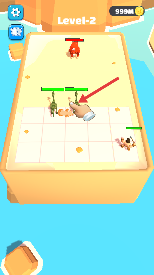 1、进入Level-2关卡,按提示拖动绿色恐龙单位,将其部署到合适格子,组建初始战斗阵容,准备迎敌。