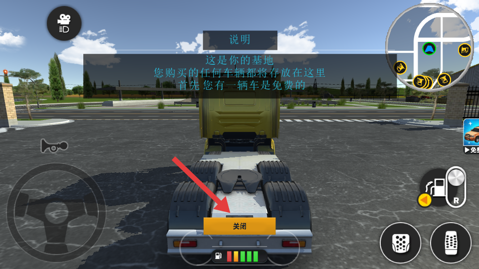 1、进入游戏后,在工程车车库选择初始需要的设备,点击驾驶按钮进入施工场地,通过虚拟按键熟悉挖掘机的挖掘、提升等基础操作。