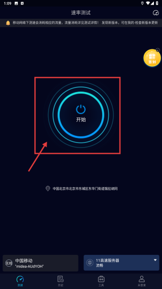 2、在速率测试页,点击开始按钮,启动网络速率测试流程。