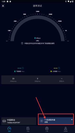 3、测试中/后,可点击底部服务器选项,选择1.17.0测速服务器-电信等进行测试。