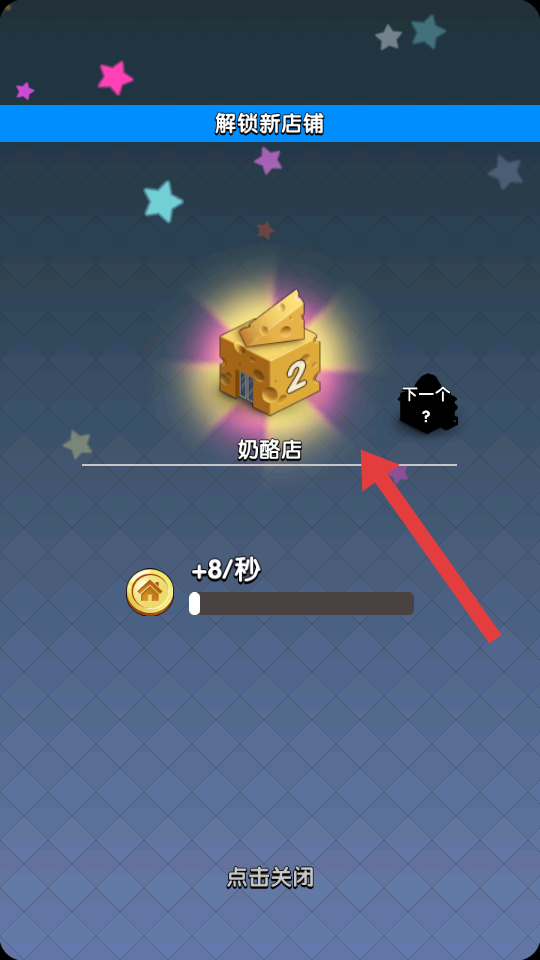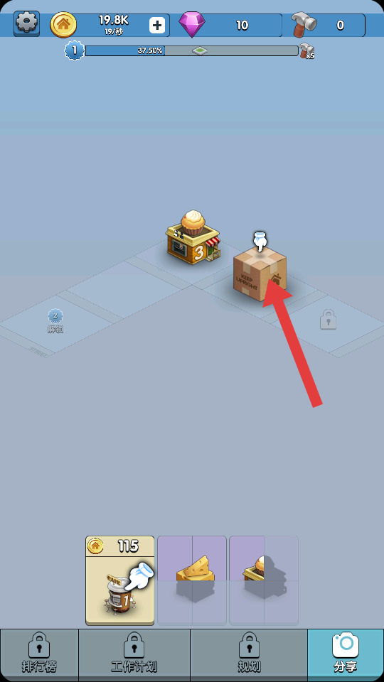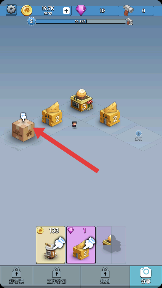 2、点击带感叹号的建筑如箱子,升级现有店铺如蛋糕店到3级,提升收益效率,同步的推进等级的进度。