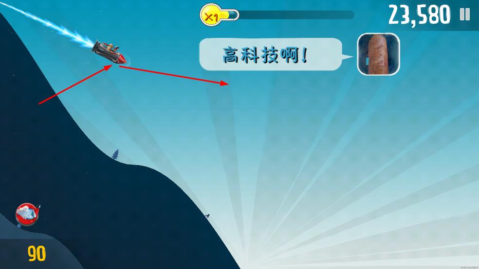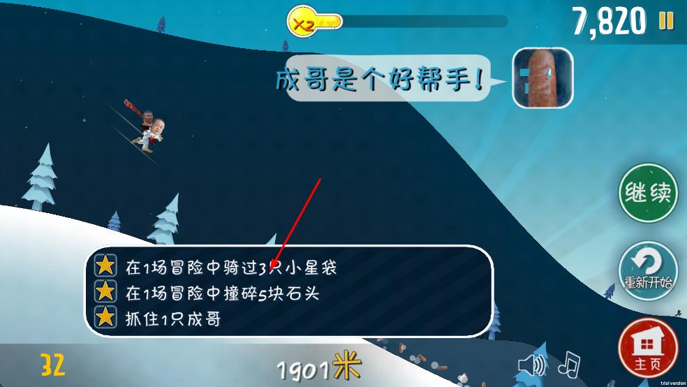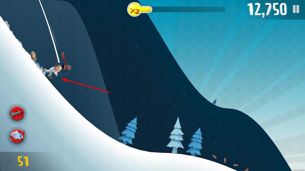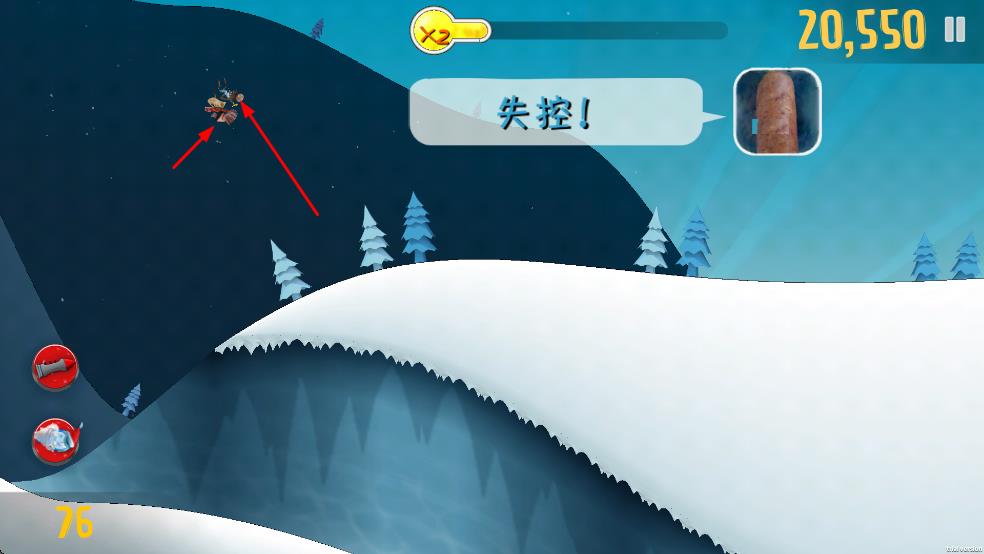1、控制角色沿雪山下滑,通过点击/滑动触发特技,增加分数与加速。