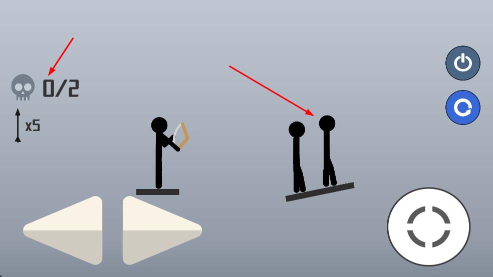 2、瞄准敌方火柴人,释放按钮发射弩箭,依左上角骷髅计数,规划射击消灭全部目标。