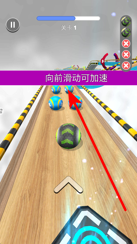 1、操控主球前行:通过屏幕上的操作按键或手势,控制主球在赛道上的平稳移动,左右的调整方向、精准把控速度,避开障碍朝终点奔。