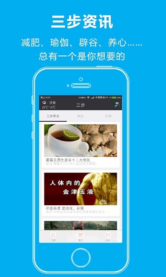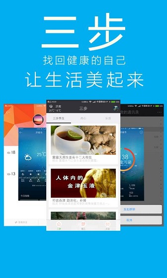 3、天气预报,数据化的生活指南。 三步养生,一步步找回健康的自己。 三步社群,拥有自己的私密养生圈。