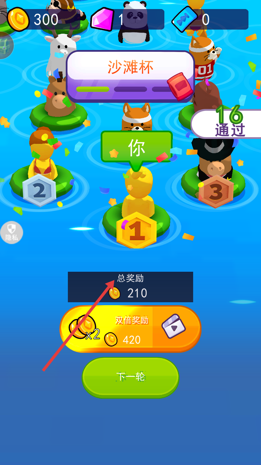 3、完成【沙滩杯】竞速,拿下第1名可领【210-总奖励】,也可看广告领【双倍奖励-420】金币,积累资源。