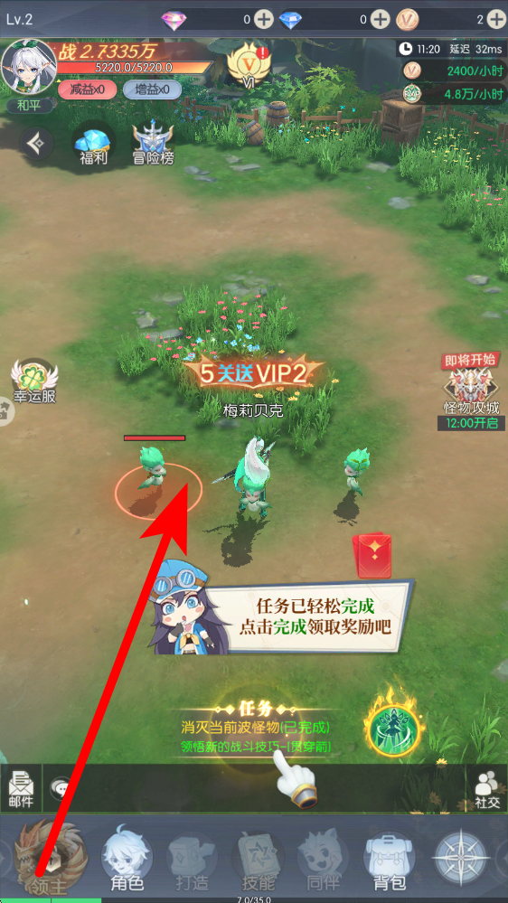1、新手开始游戏在场景中,根据任务消灭对应波次怪物绿色小怪,完成消灭当前波怪物任务,推动冒险进程,为后续挑战与奖励获取奠基。