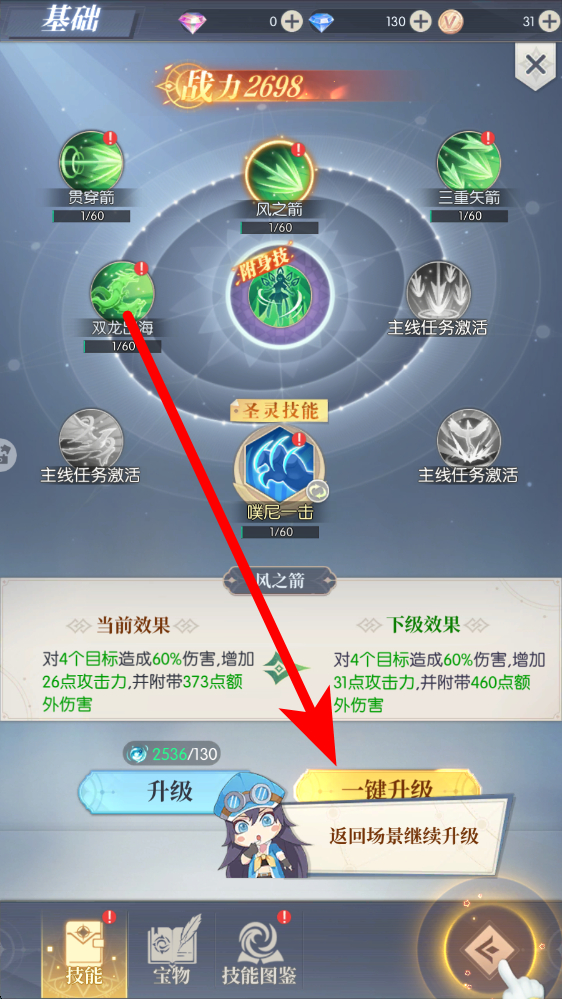 3、继续提升进入技能界面,选择需升级技能风之箭,点击一键升级,消耗资源提升技能等级,增强技能伤害与附加效果,助力战斗输出。