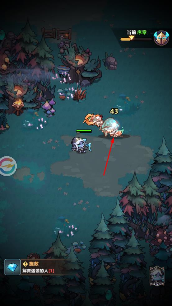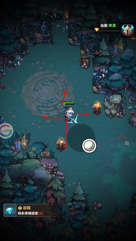 1、在森林场景,通过虚拟摇杆操控角色移动,接取向永夜城进发任务,开启冒险。