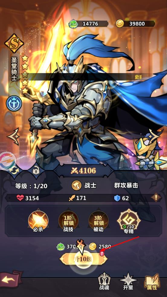 3、进入英雄界面,消耗金币等资源升级如圣堂骑士升10级,解锁战技、被动等能力。