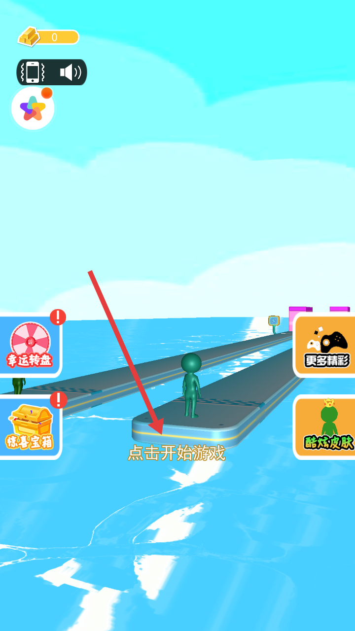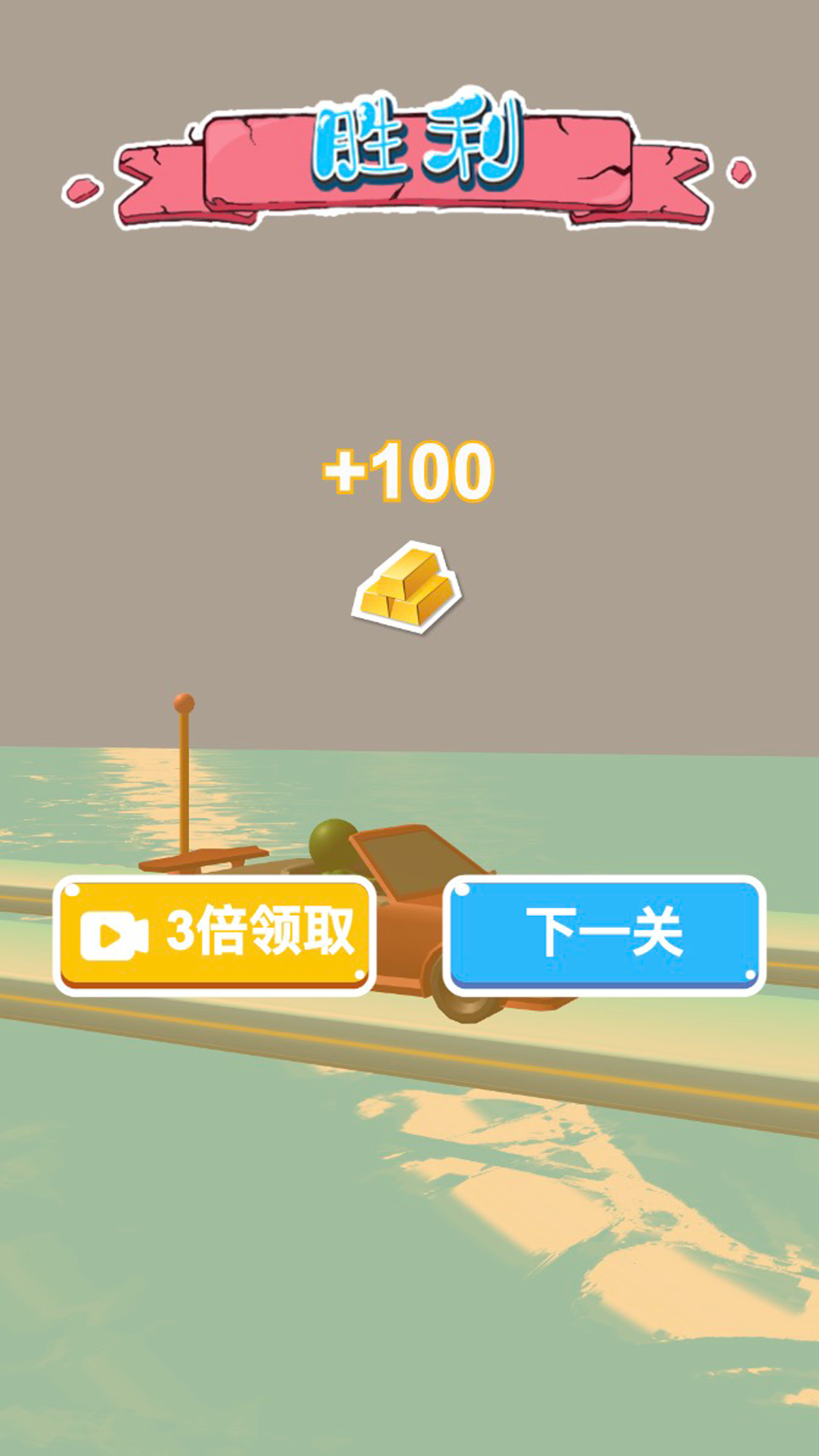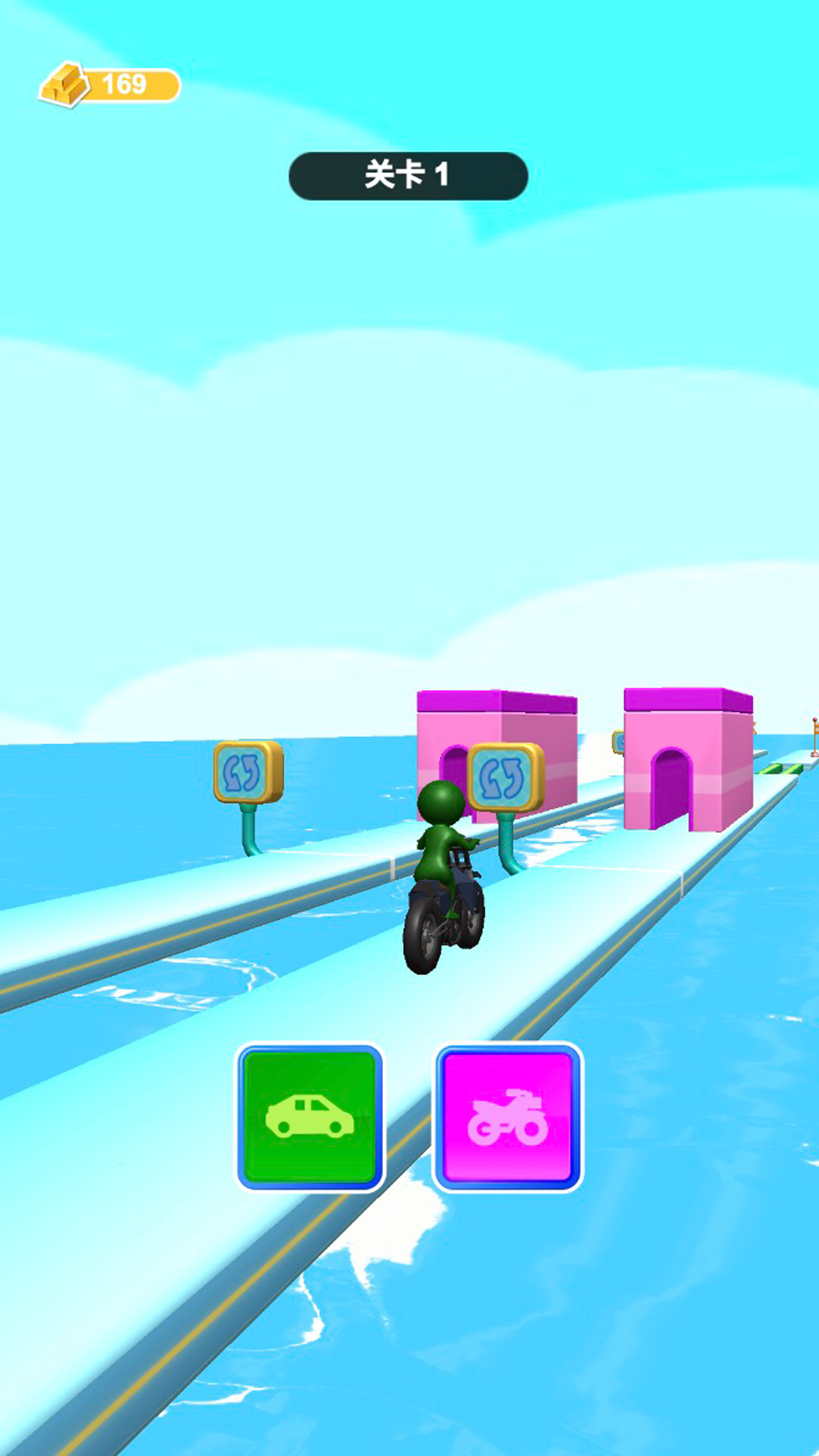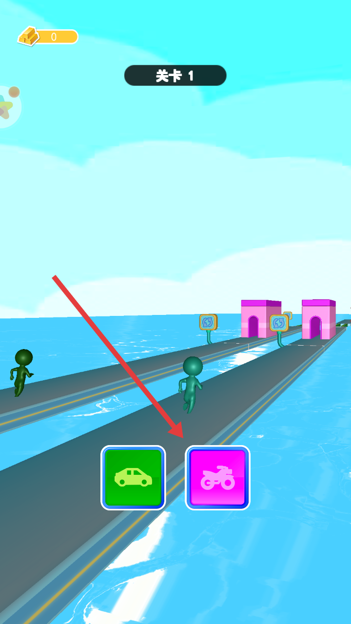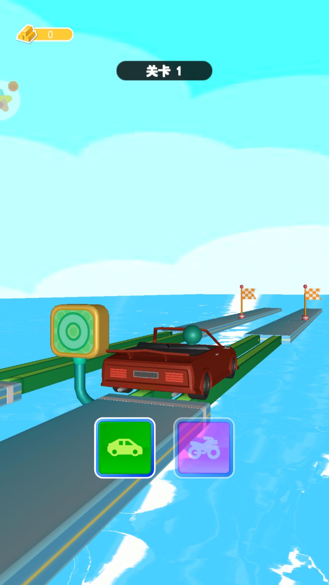 1、点击开始游戏进入关卡1,界面会弹出汽车、摩托两种载具选项,选其一操控绿色小人驾驶,沿水上道路出发。