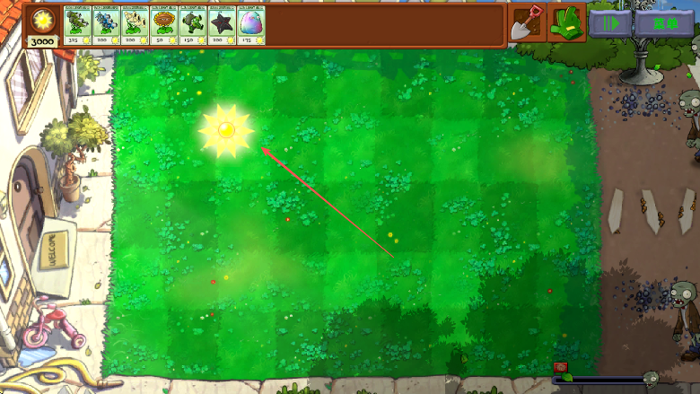 1、进入游戏,点击收集阳光获取资源、选择上方植物种植到草坪、抵御右侧出现的僵尸进攻。
