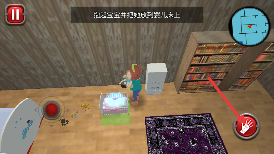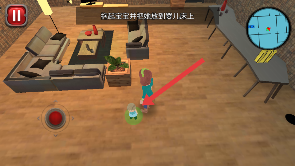2、根据相关的指示来到客厅,按照上方抱起宝宝并把她放到婴儿床上,过程中角色要小心避开周围的障碍物。