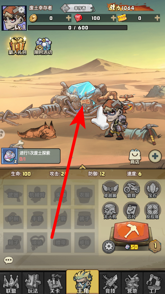 1、进入游戏后,点击场景中的探索目标废土机械残骸,触发探索流程,完成进行1次废土探索任务,获取资源与装备,推进废土冒险进程。