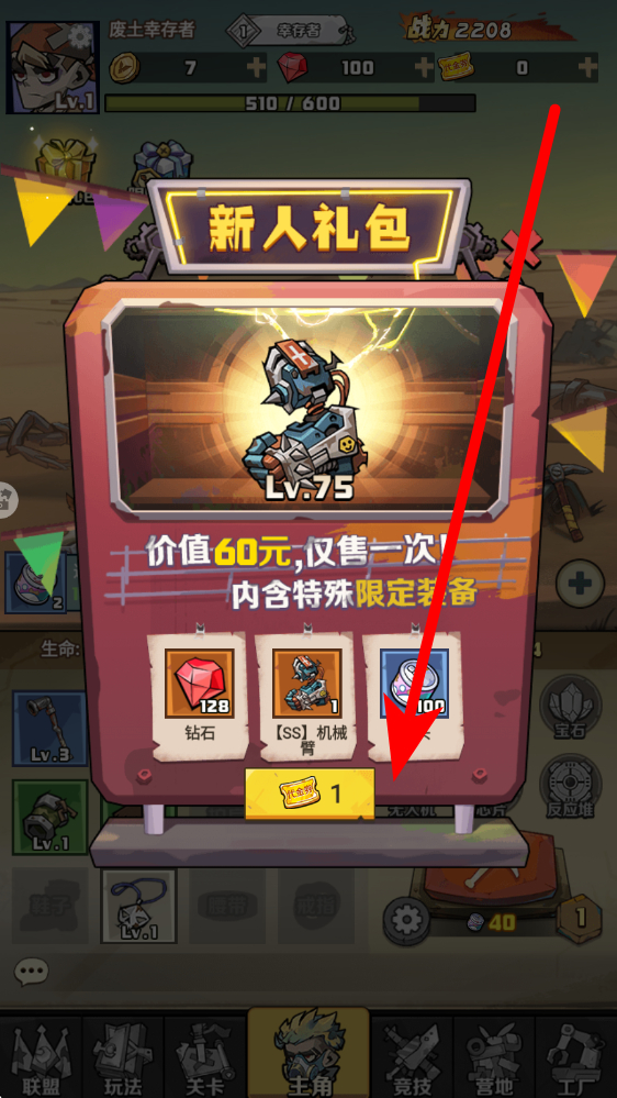 3、留意新人礼包界面,若有购买需求,点击1元购买按钮含特殊限定装备的礼包,获取礼包内的钻石、机械臂等资源,助力前期成长。