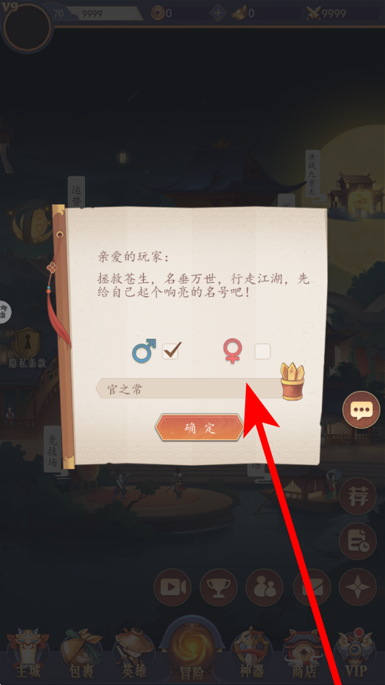 1、新人刚进入游戏,首先需要选择性别,在输入框起响亮名号,点击确定完成角色创建,开启冒险之旅,为后续行动奠定基础。