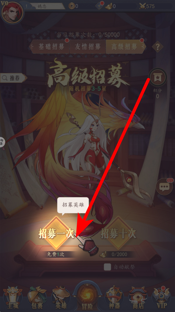 2、然后前往高级招募界面,点击招募一次有免费次数时优先使用,获取初始英雄角色,借助招募扩充队伍,提升队伍战力储备。
