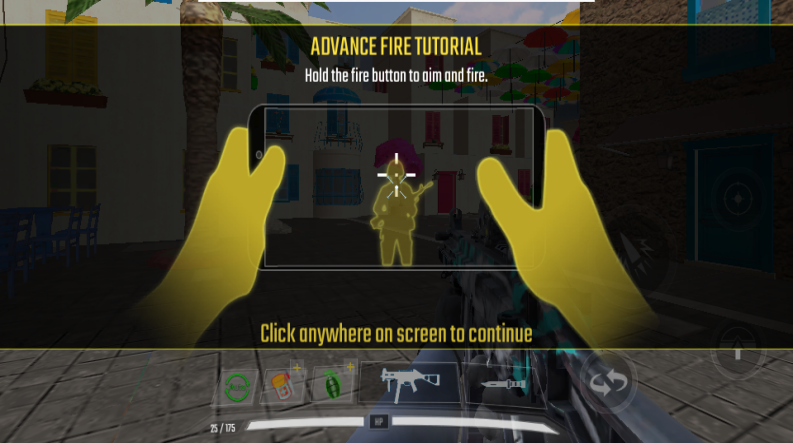 1、进入射击游戏,先熟悉界面,右侧火箭弹按钮是关键技能,左侧控制移动、瞄准敌人如场景中持枪角色等等。
