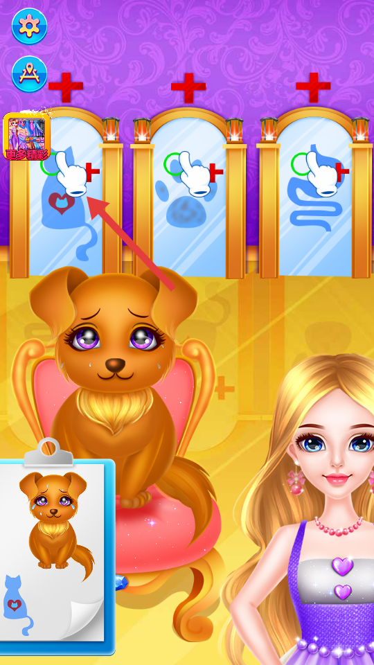 1、病症诊断互动性:诊断时需通过点击、滑动等操作与小动物互动,比如用听诊器在小狗胸口移动听心跳,用放大镜查看小猫皮肤红疹增强诊疗的参与感。