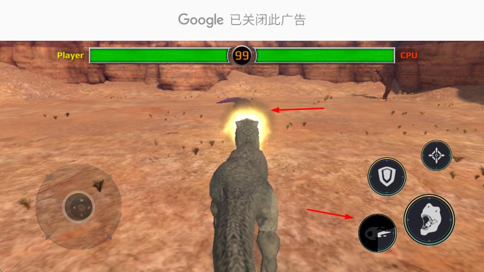2、左虚拟摇杆操控恐龙移动,右侧按键释放技能攻击、防御、特殊技,与敌方恐龙战斗。