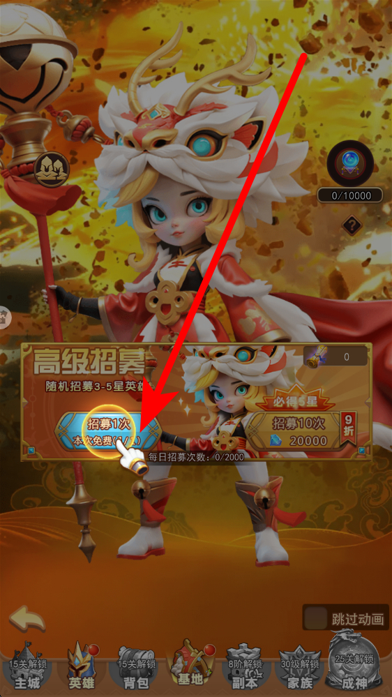 1、获取新的英雄角色,需要进入高级招募,点击招募1次有免费次数优先用,获取英雄,扩充队伍,为闯关储备战力,提升阵容强度。